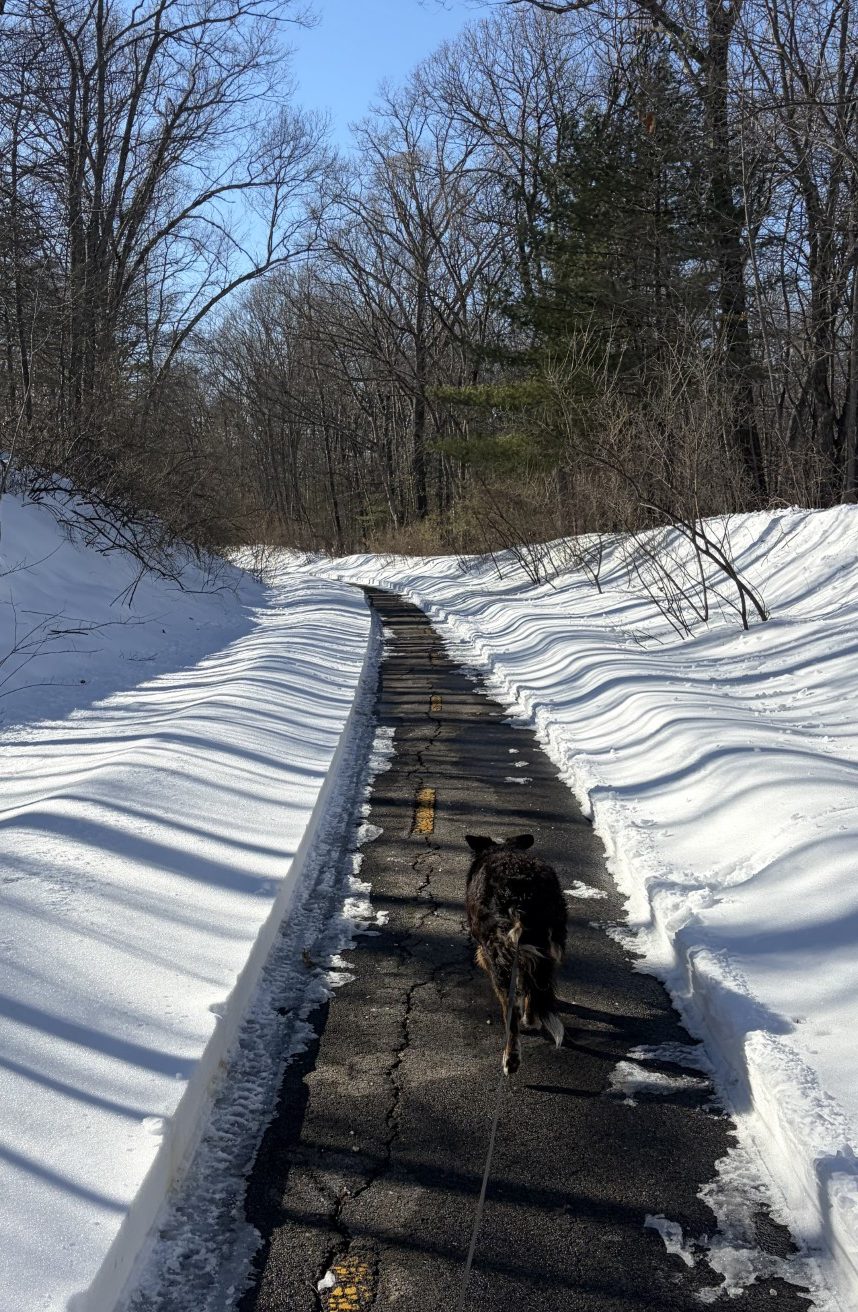 The sky is blue, the temperature is just above freezing and the ground is still blanketed in a thick layer of white snow. There are places where the snow is deeper than Waldo is tall. No more snow has fallen, so I plan to go our usual distance in the Hudson no-plow zone. The white shawl that covered the branches of the trees after the last storm is now all gone and the sunlight shines brightly through the trees, nearly unhindered, to the ground unhindered. Birds are out chirruping, but I hear no new species, just my old fine-feathered friends that winter out here.