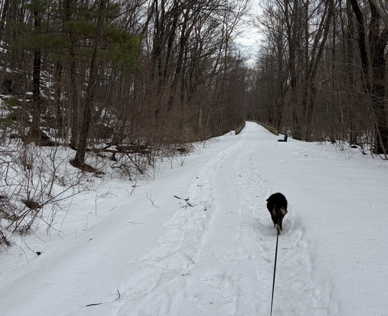 When we get to the new park, at the Fort Meadow Reservoir overlook, we have passed several people and their dogs and a few joggers. I remember in my younger jogging days, I would go running in 11℉ weather, wearing jersey pants, a hooded jersey jacket over a tee shirt, knitted gloves and little else. I not only was quite comfortable, I was sweating. Some of the joggers we pass are wearing long sleeve tee shirts and shorts! Their legs are bright red from the cold. I cringe at the sight, but they seem not to be troubled by the cold at all. Ah, the resilience of youth… We see no bicycles out today, although I do see their spoor — tire tracks in the snow, here and there. Waldo is much pleased and is not spending that much time glancing to our rear, like he does in biking season.