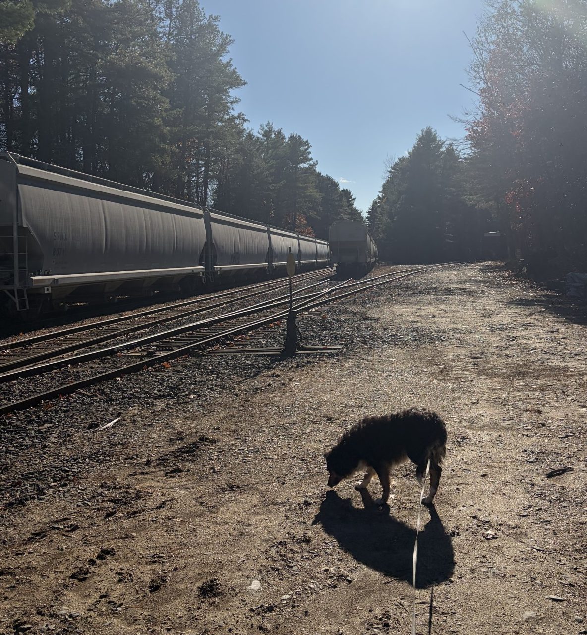 The area that has the active railway is flat and broad, having up to two sidings in addition to the main line. On the sidings, at various places, are long strings of railroad cars, coupled together. They look like what’s used to carry grain or liquids. The rails on which they sit are quite rusted, so they haven’t seen a lot of use in the recent past. The rust is solid enough that I’m guessing the cars haven’t been moved much in years. In between the three sets of rails, and sometimes on the sides as well, are broad aprons of tarmac. That makes for easy walking and Waldo and I make good progress. As I hoped, there is absolutely no one around.