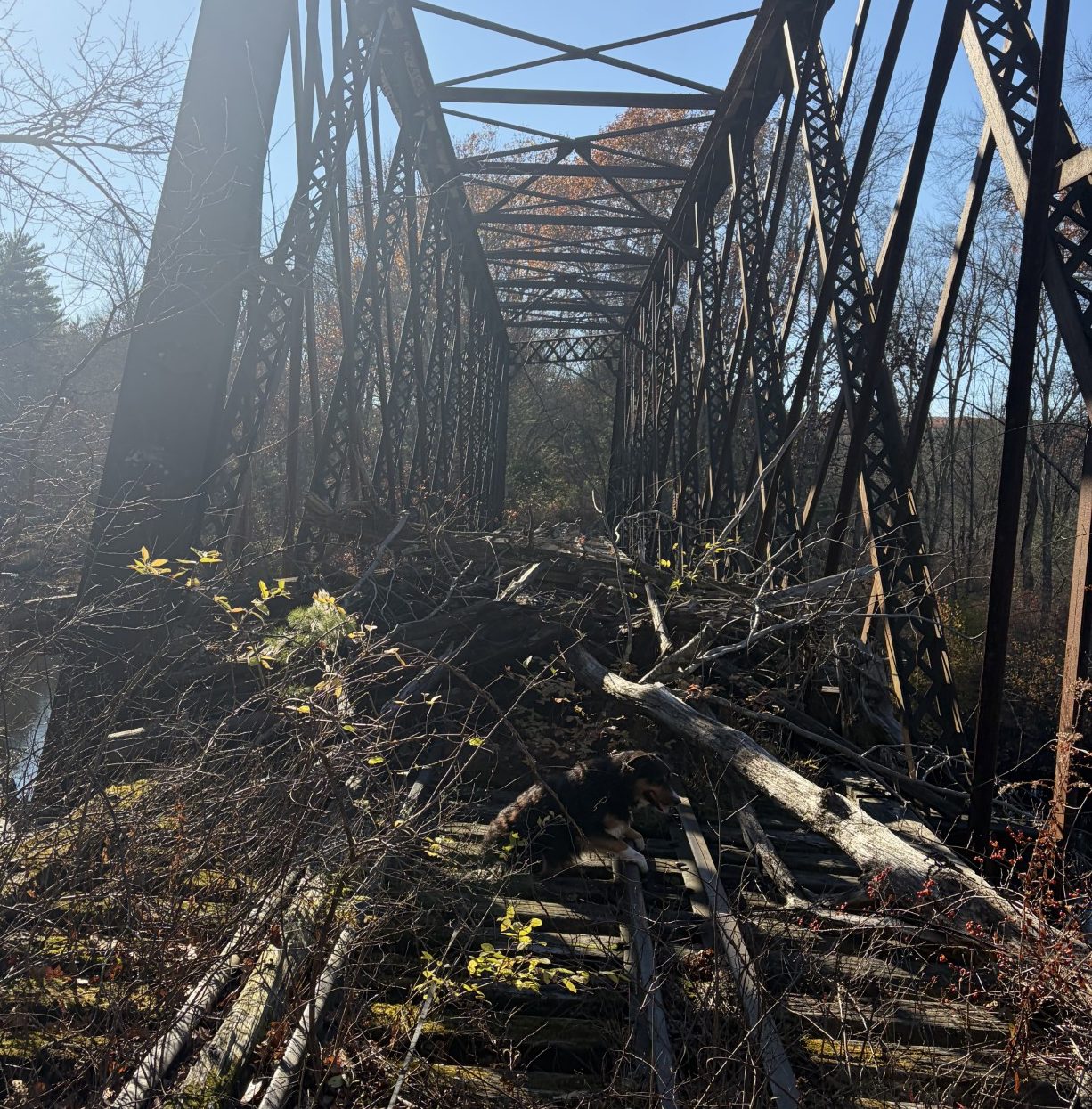 Waldo stares down at the holes in the bridge and through the wide-open spaces between the girders and whines. I softly encourage him some more and pull on his collar. Finally, he decides I am not going to give up on this completely foolhardy, and totally unnecessary, venture and reluctantly climbs over the rocks and onto the bridge ties. We move over, closer to the middle of the bridge, and he seems to decide that, hey, it’s not as bad as he thought, and we continue happily on our way, tail wagging and all.
