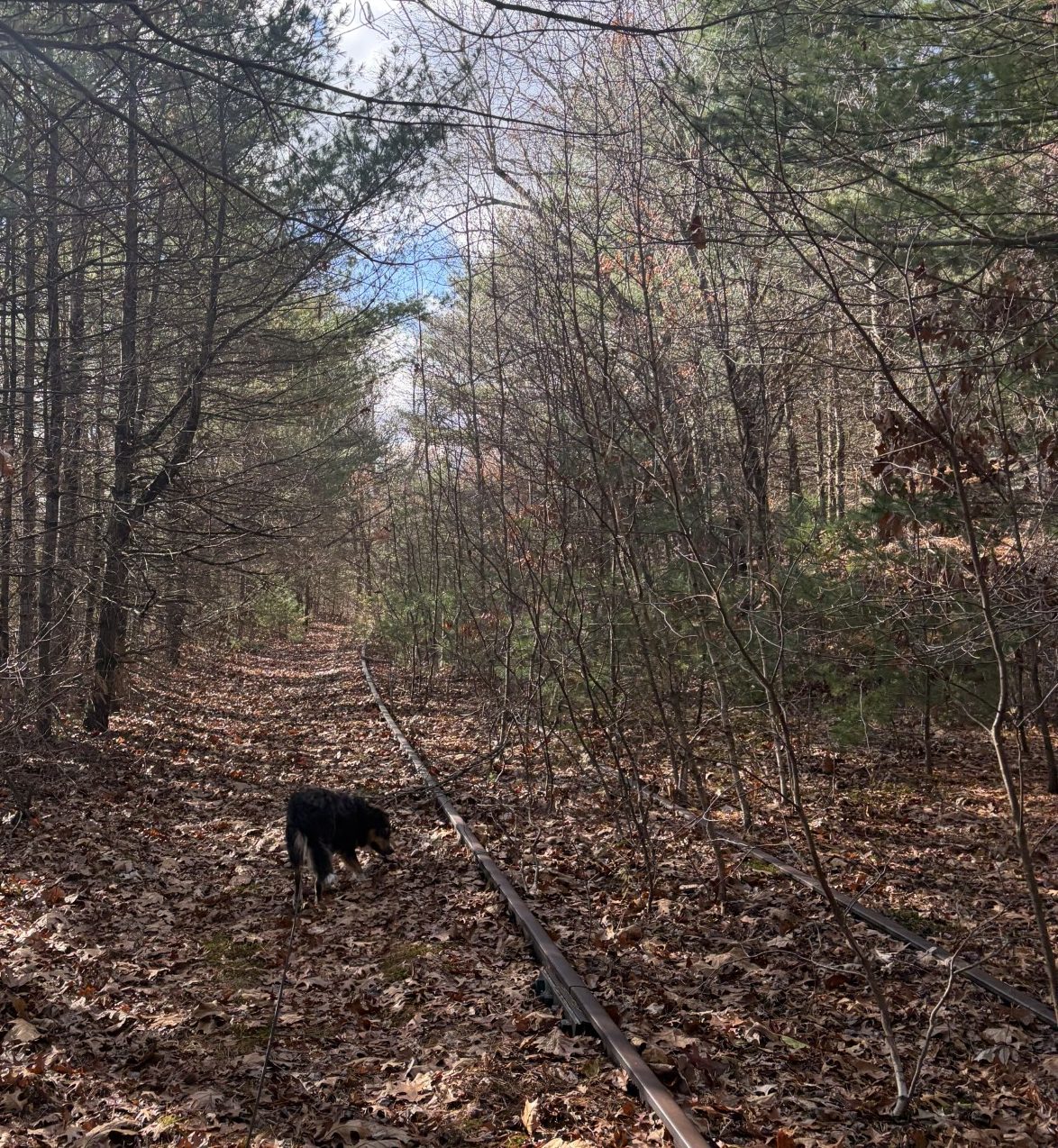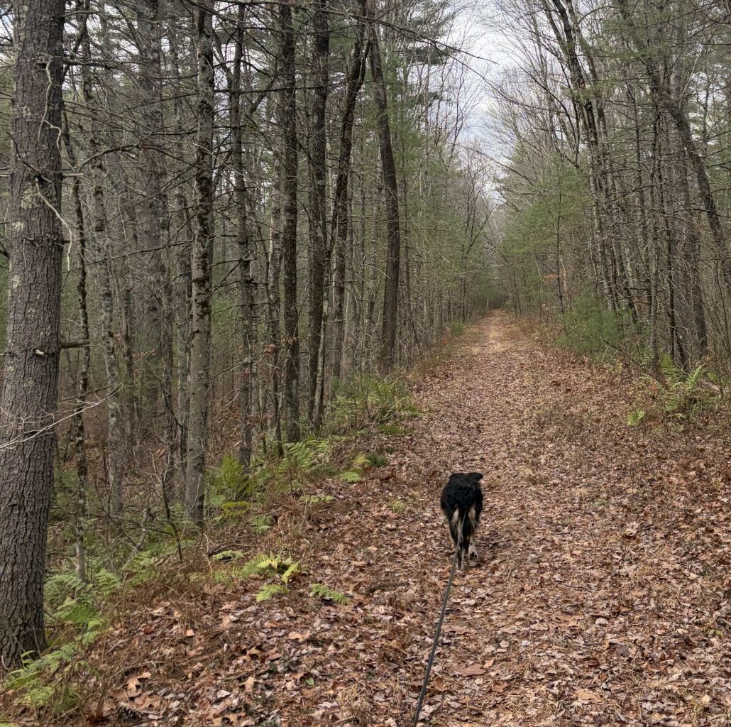 Waldo is off and gone at the forward end of the leash, trotting along and clearly happy at being on another adventure. I follow at a comfortable pace and we’re making good progress. The surrounding country is not that much different from that on the other side of the road; I don’t understand why the tracks are so much clearer. It’s not long and we cross a small bridge that spans a creek. It has the same 3-inch open spaces between the ties that the bridge over the Ware River had. Waldo doesn’t balk a bit. He seems to have learned that it isn’t as threatening as he first thought. A little touch of hubris, I think, because, at one point, a back foot goes through the gap between the ties and he lands on his butt. He extricates himself, none the worse for wear, and continues on, just a bit more slowly. It seems he’s learned not to put his weight on a foot until it makes contact with something more solid than the ether. Hmmm. Another bumper sticker?