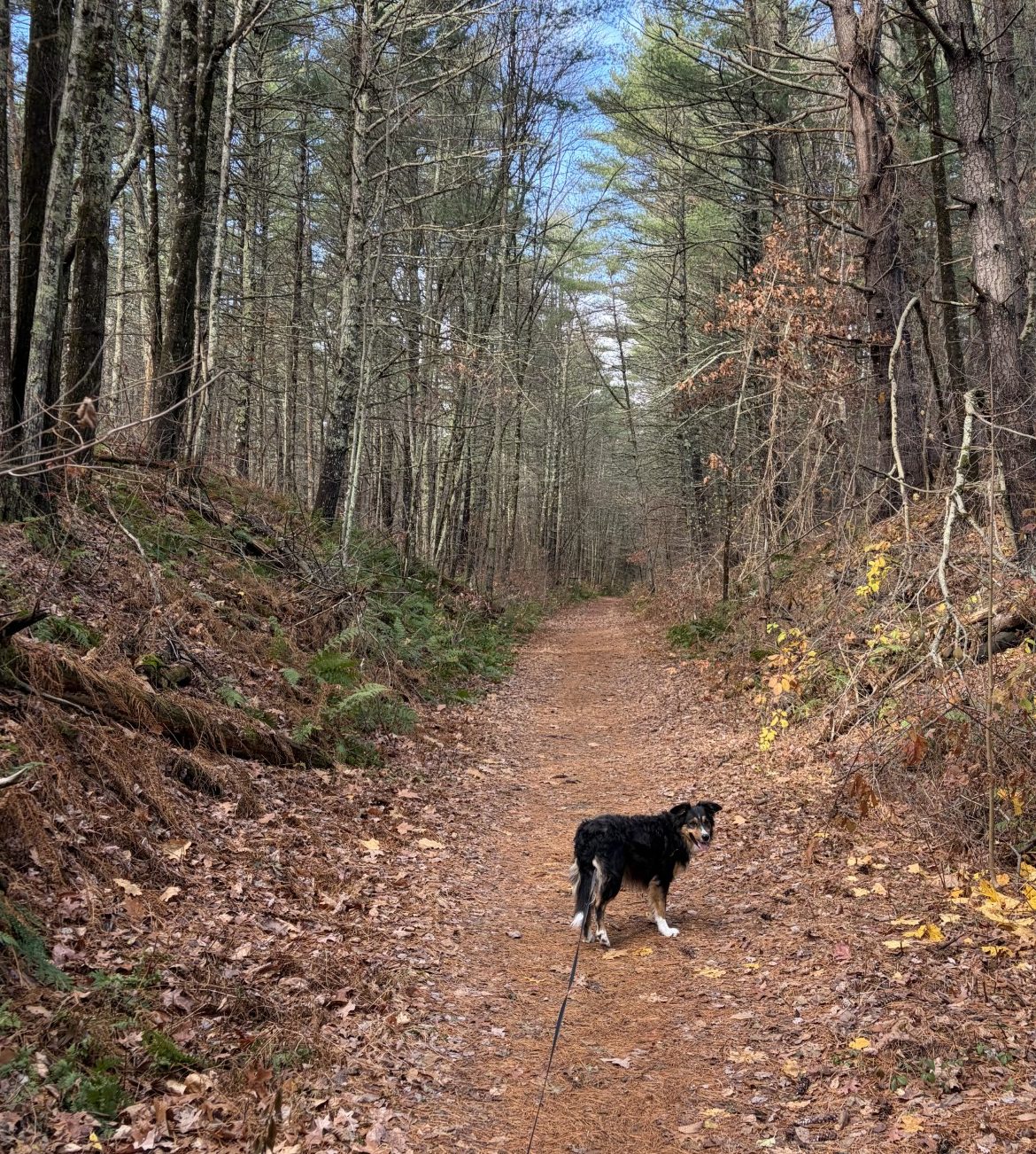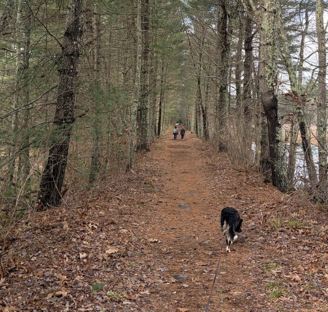 Waldo is up ahead, at his usual position, doing his Waldo thing. He needs no direction. Our course is obvious, even to a border collie who loves to search out different paths to take. I don’t know what he’s doing up there, but whatever it is, he’s happily doing it without feeling the need to involve me. We pass 4 other people with dogs, and one couple without, who are out for a walk on a cool autumn day, just like us. We also pass 2 bicycles, but Waldo doesn’t seem particularly bothered by them like he is on the Assebet River Rail Trail. I’m left with lots of time for my mind to wander as it is wont to do.