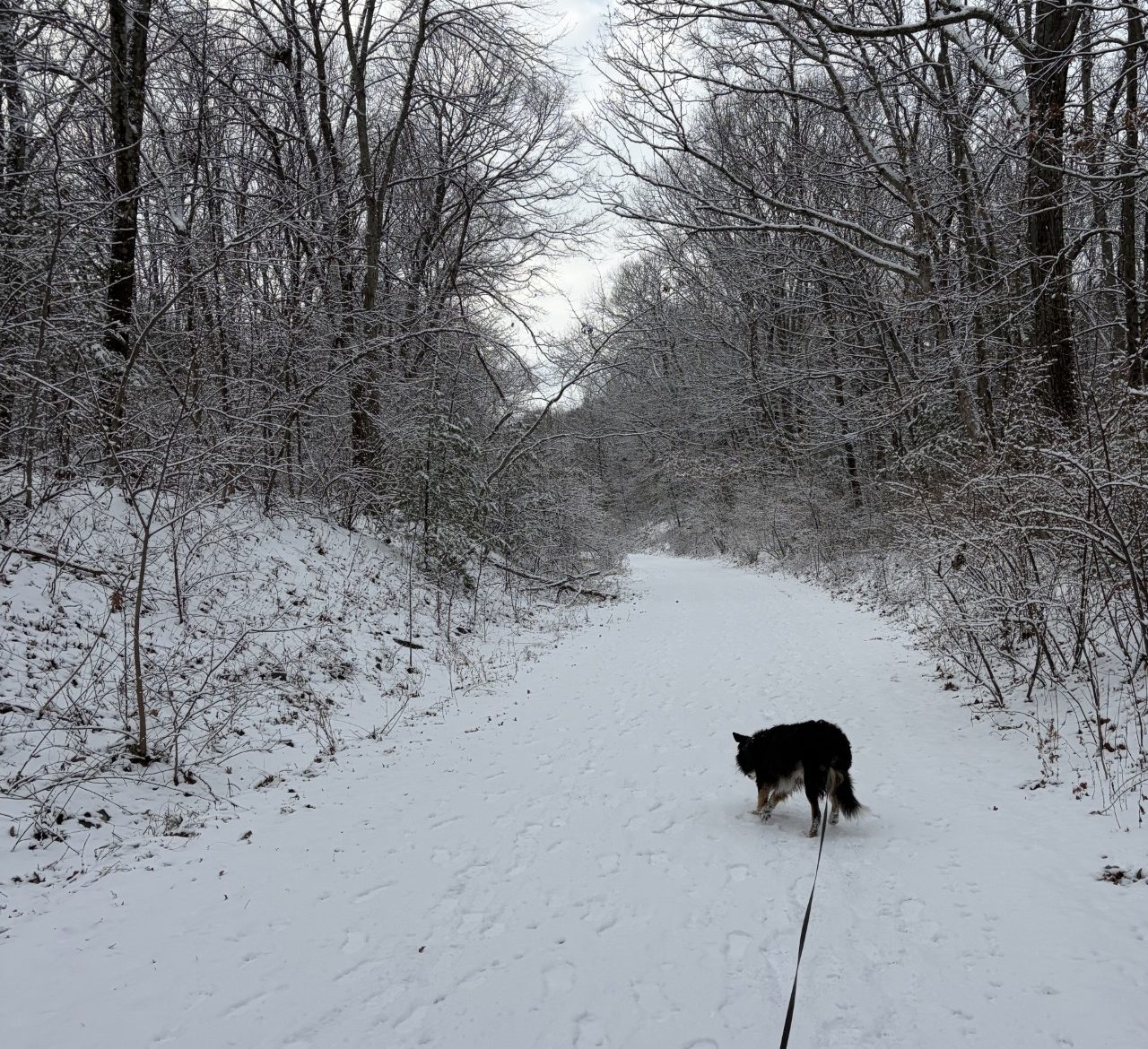 One could do a fine rendering of what I see in front of me, using only sepia ink on the whitest of paper – along with a dash of thin light green watercolor, here and there, to suggest the occasional presence of white pine drowning in a sea of spindly, barren, beige limbs. I suppose, the artist would also need a pinch of black to show Waldo’s sable birthday suit and the leash that connects us. Oh, and a slightly meandering path, about two feet wide, where the underlying tarmac has been exposed by some means of snow removal. It’s overcast, so no robin’s egg blue for the sky, and no yellow for the sun, is needed, either. Just sepia ink on white paper with a smidgeon of green and a bit of black is all the palette that would be needed.
