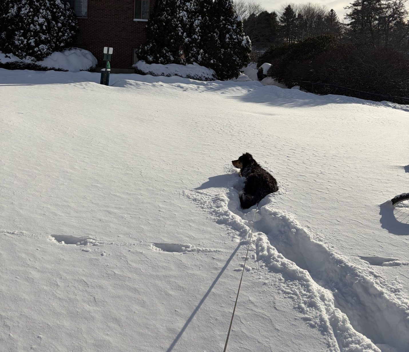 Waldo’s loving it. Whereas I leave a sort-of trench behind me (albeit a collapsed one) wherever I go, sometimes Waldo leaves big gaping holes in the snow where he has porpoised, leaping completely out of the stuff and landing a good six feet away, without disturbing the sparkling whiteness in between. Damn! I wish I had 10% of that energy. When standing still, only his black back shows above the smooth ivory surface, almost as if he’s floating. Then he stares at a particular spot, as if an idea was forming in his head, and suddenly jabs his nose and face deep in the snow and snorts. It sounds like he let out a long fart. When he pulls his face out and continues on, he’s covered in a dusting of what looks like confectionary sugar. If I pause for a brief respite, to replenish my will to continue, Waldo is over on his back, making snow-doggies. Yep, he’s really gotta get out.