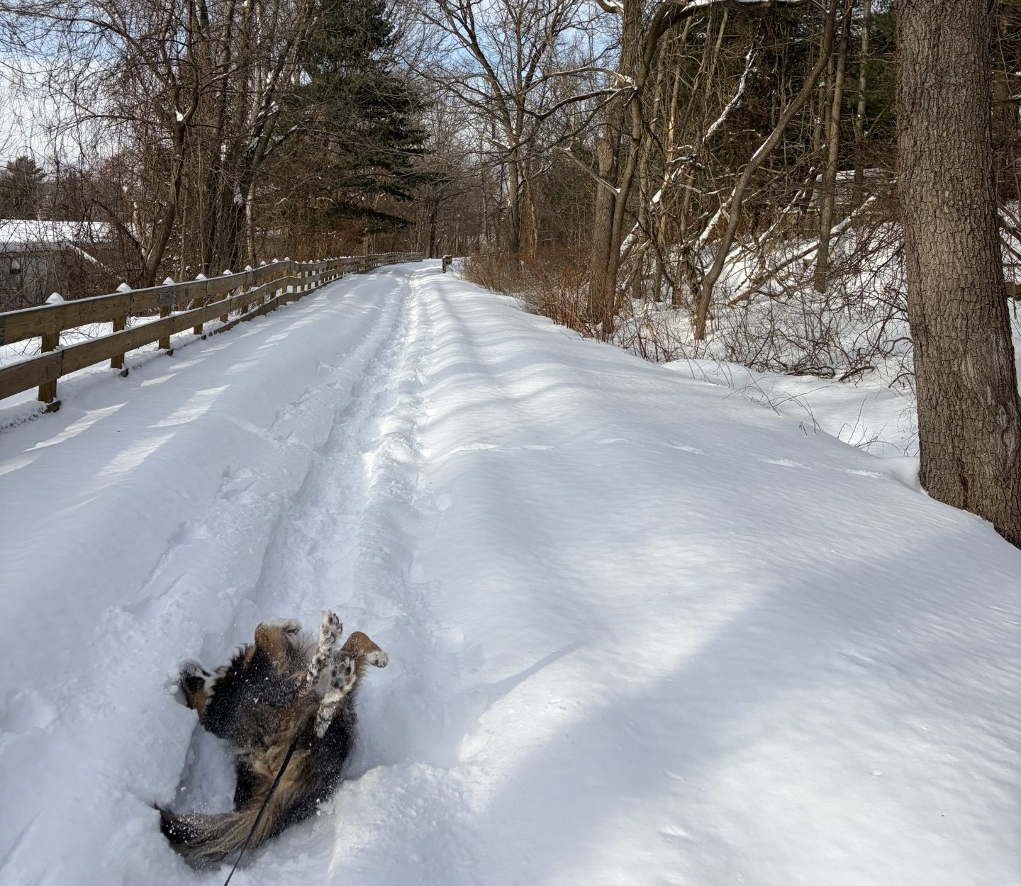 Once on the trail, Waldo surges up ahead, pulling the leash out to its full extent, eagerly bounding along. Of course, because it is the rail trail, other people and dogs have been here and left their spoor, recognizable only as a vague disturbance in the snow. But no bikes. No way. That means that Waldo’s spirit is completely unencumbered by angst and he is letting it all out. It does the soul good to see a dog enjoy himself so much.