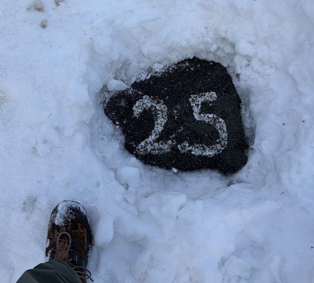 Someone, sometime in the past, painted mile-markers on the trail, every half-mile, from the beginning in Marlborough to 3.0 miles in Hudson. I don’t know why, nor do I know why they stopped at 3.0, but they’re there, on the northbound side of the trail, measuring about 6”, or so, in height. In Marlborough, the plow has exposed them, but they are still buried under more than a foot of snow in Hudson. The 2.5-mile marker, I can find with extreme accuracy, so I dig a hole in the snow and expose it to the daylight. I’ve always wondered what others might think of seeing a deep hole in the snow, perfectly centered around the numbers, “2.5”, in the midst of undisturbed whiteness. While I’m doing that, Waldo is making snow-doggies, not far away. I can’t find the 3.0-mile marker, though I do kick the snow around a bit.