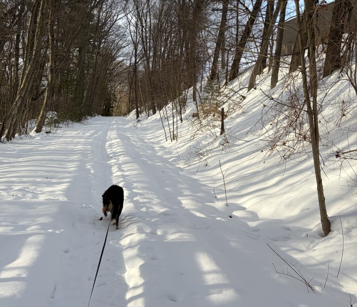 Today’s forecast calls for high temperatures that will be tickling 40℉. With windchill, that should translate to something around 31℉, definitely something Waldo and I don’t want to miss on the rail trail. The sky is pale blue and sunny. We had an inch of snow fall last night, but the tarmac, at least the Marlborough part, should be clear enough for an easy stroll. I feel recovered enough from my recent illness to be able to do at least that much, so we head out. Waldo is still peeing a lot, but that’s no problem out here.