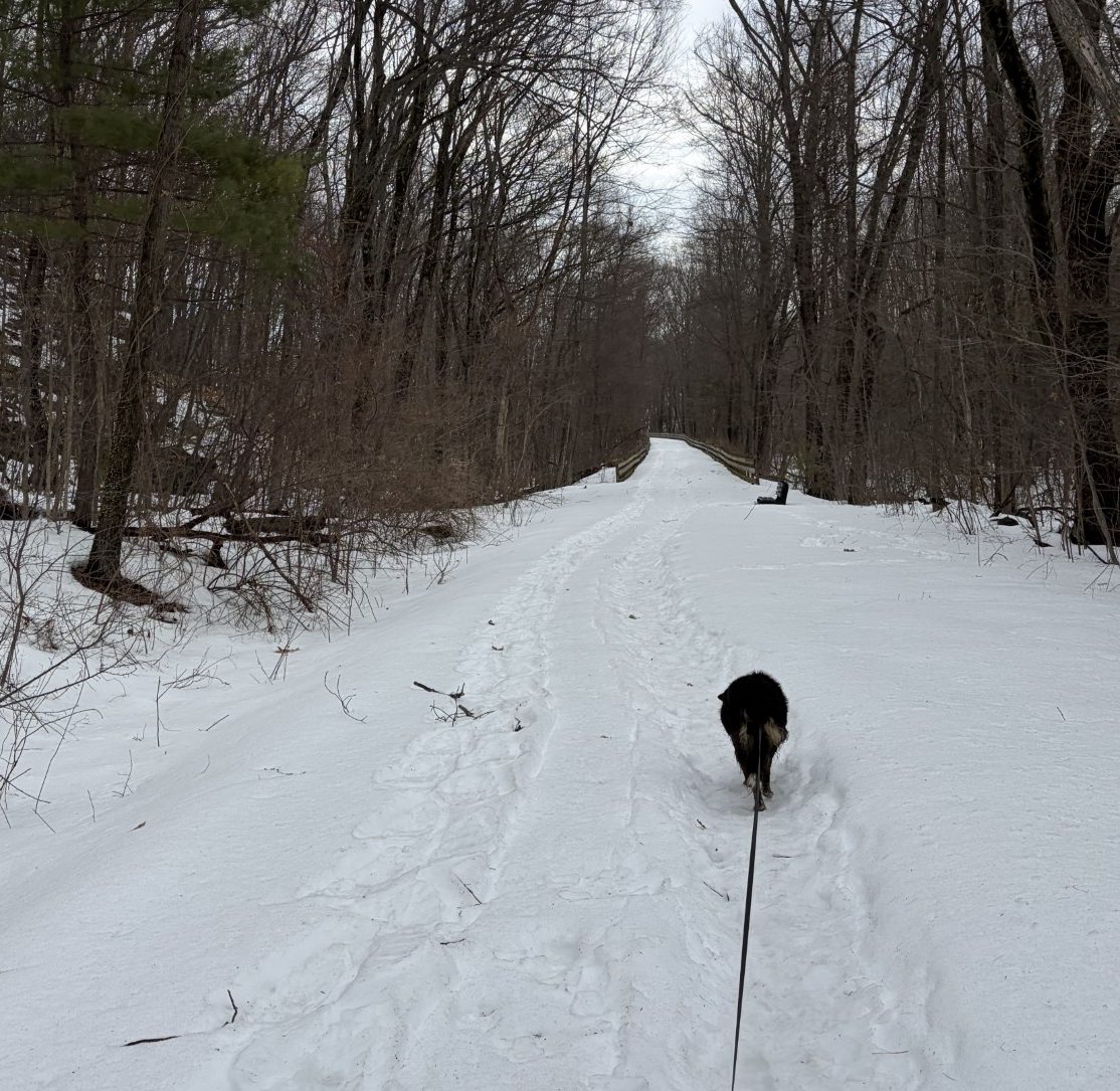The path in Hudson is still quite walkable – no ice has formed yet. As I come near to the place where the 3.0 marker has been painted on the tarmac, I kick at the hardpack snow, trying to find it. Waldo watches me, wondering, no doubt, what I’m up to, then rolls around in the snow, waiting for me to finish doing whatever thing it is that I’m doing. I can get down to the blacktop surface in narrow trenches, as wide as my boot, but I’ve yet to find anything painted there. Each time I come out here, I dig away a bit more and I’m sure I’ll find it soon. But not today.