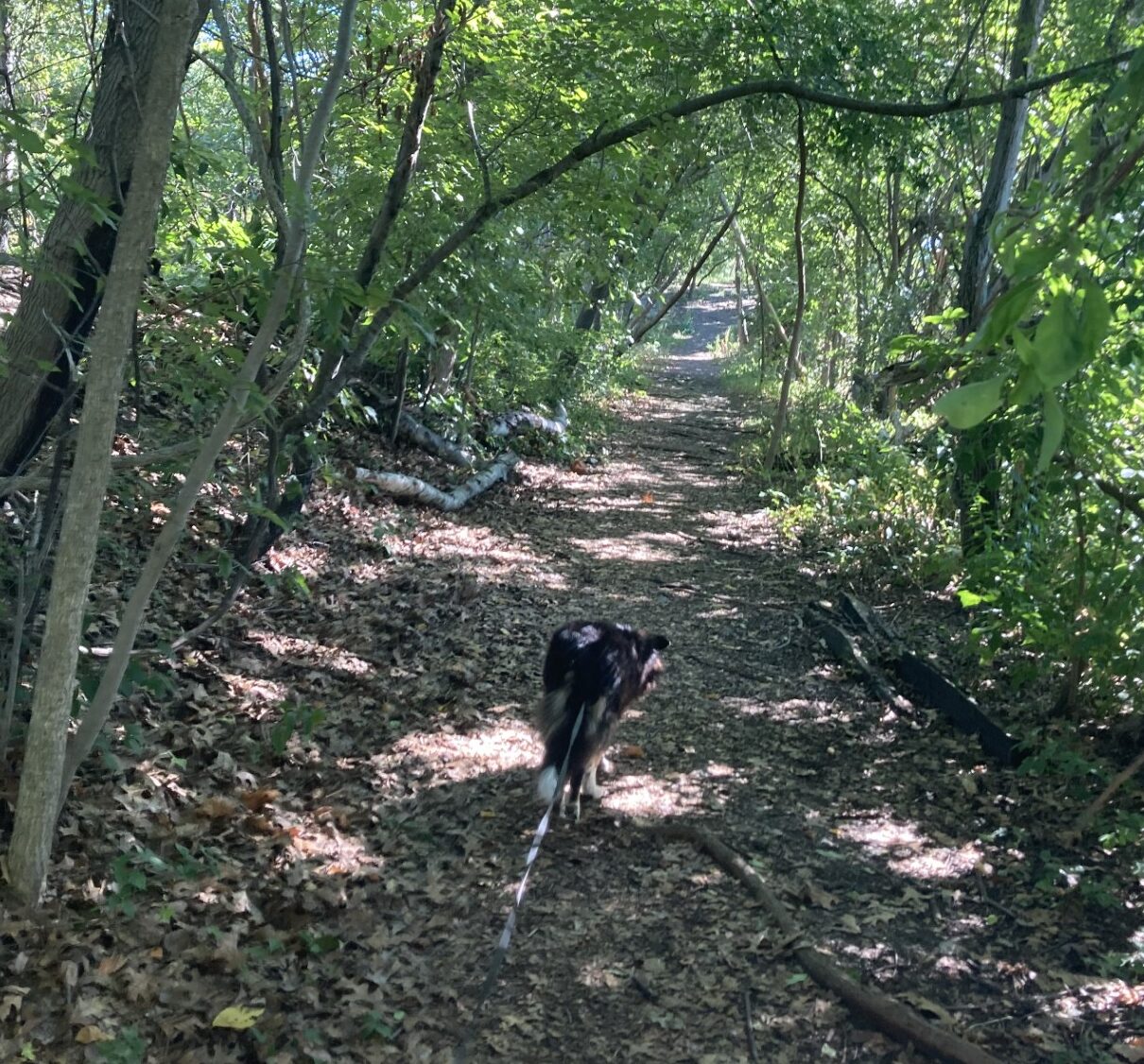 Our journey begins at one end of a strip of tarmac that serves as parking spaces for a set of commercial buildings that run alongside the tracks. Phyllis, Waldo and I were there late last fall, when the weeds and leaves were all gone. I saw, then, what looked like a broad footpath that continued on past the end of the asphalt, going along what I was convinced was the original railroad bed. Today, at first, I couldn’t find it. There’s a solid wall of foliage that starts where the blacktop stops. But when I get close, I see, beyond the weeds, there is a narrow, dusty footpath, running on a dike, through a natural arbor of tall Japanese knotweed. As soon as Waldo sees it, he’s out on point at the far end of his leash and we’re off.